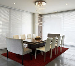 Store enrouleur à bandes alternées translucides et opaques, dont le mouvement vertical crée un jeu de lumière à la fois esthétique et fonctionnel, permettant de doser opacité et transparence avec précision.